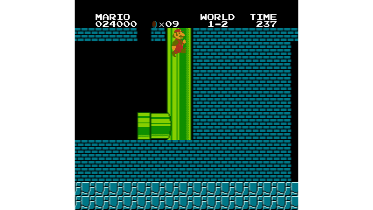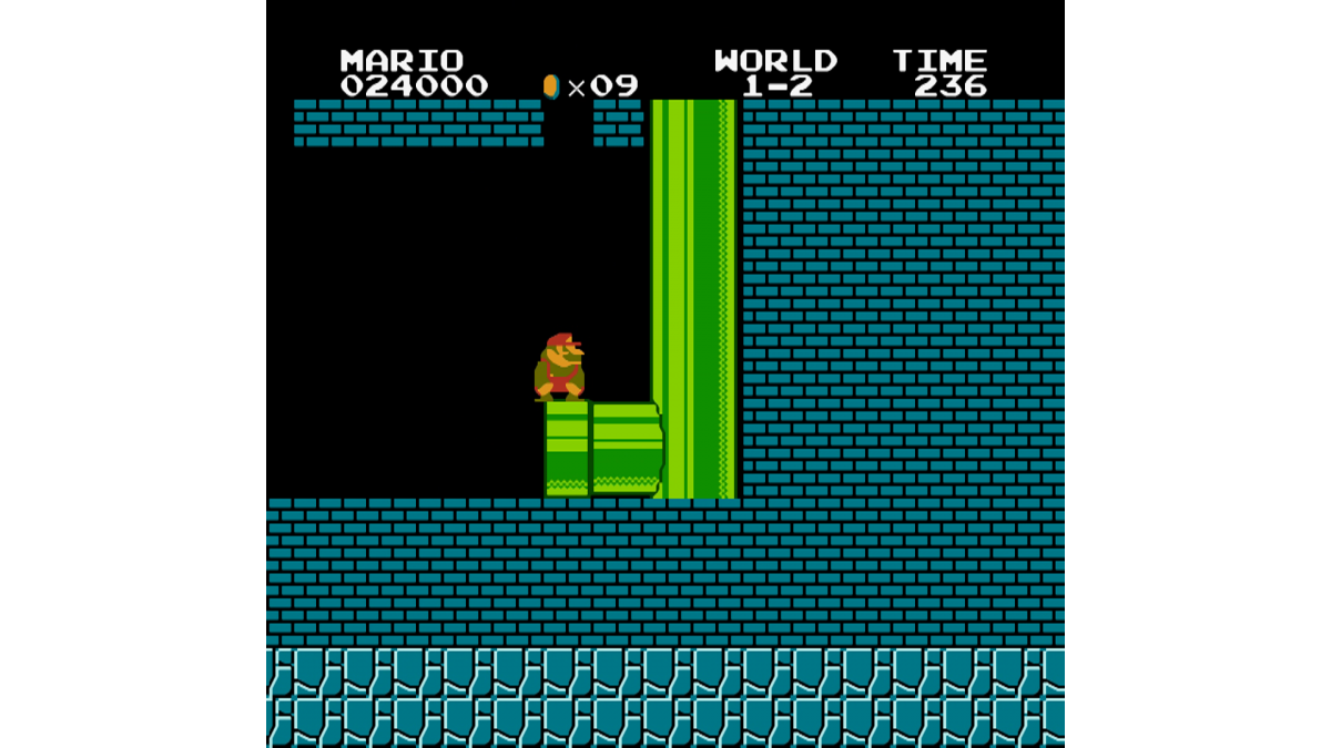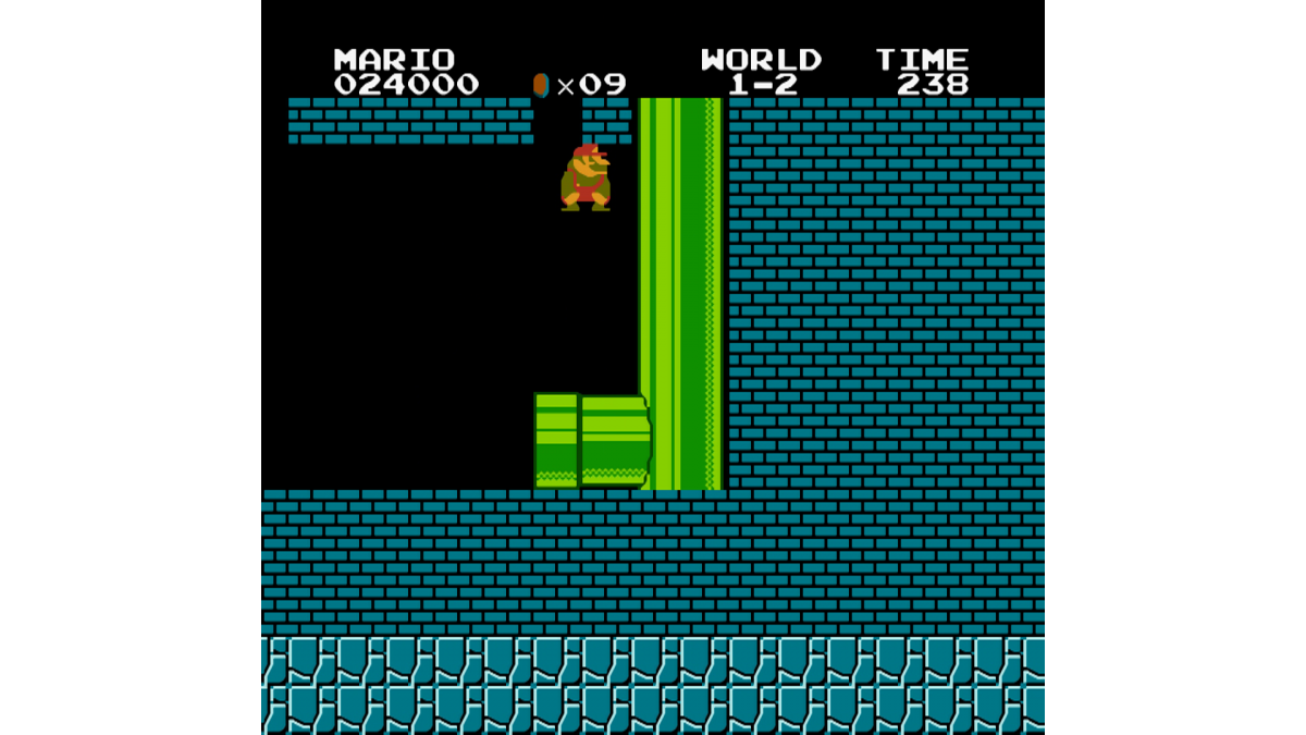 Mettez-vous accroupi et tout en restant dans cette position, sautez en diagonal de sorte à ce que Mario saute entre le bloc plus à droite et le tuyau. Si cela est fait correctement, un bug de collision permettra de passer à travers le tuyau et à travers les blocs. Le personnage se mettra debout et avancera tout seul, vous pouvez l’aider un peu en courant !