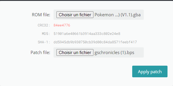 - Télécharger le Patch disponible dans la fiche de la ROM-Hack (par exemple Pokémon GS Chronicles)