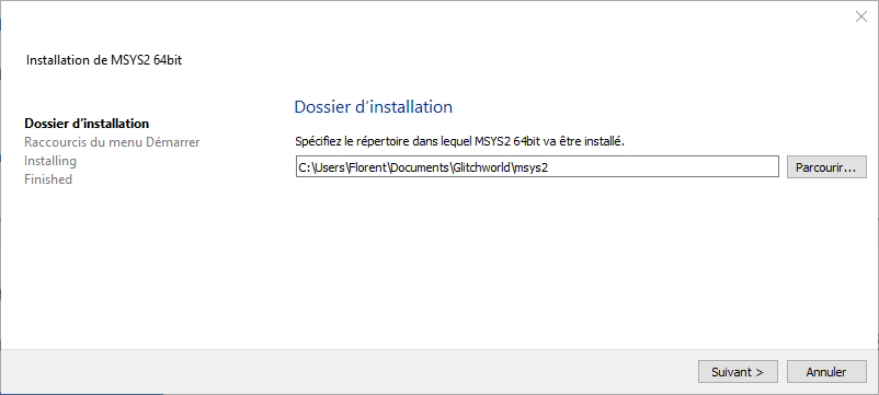 On va vous demander où vous voulez installer le logiciel, il faudra le mettre dans le dossier msys2 que l'on a créé au début.