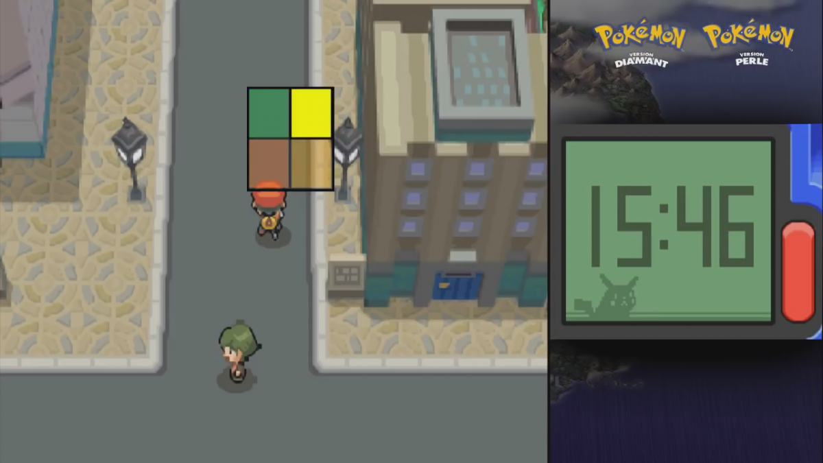 Autre tweak, autre lieu… celui-ci nous permet de changer la palette de couleur de Sinnoh par celle de la zone mystère, elle est particulièrement glitchée, entre autres les routes et les maisons sont mal affichées.