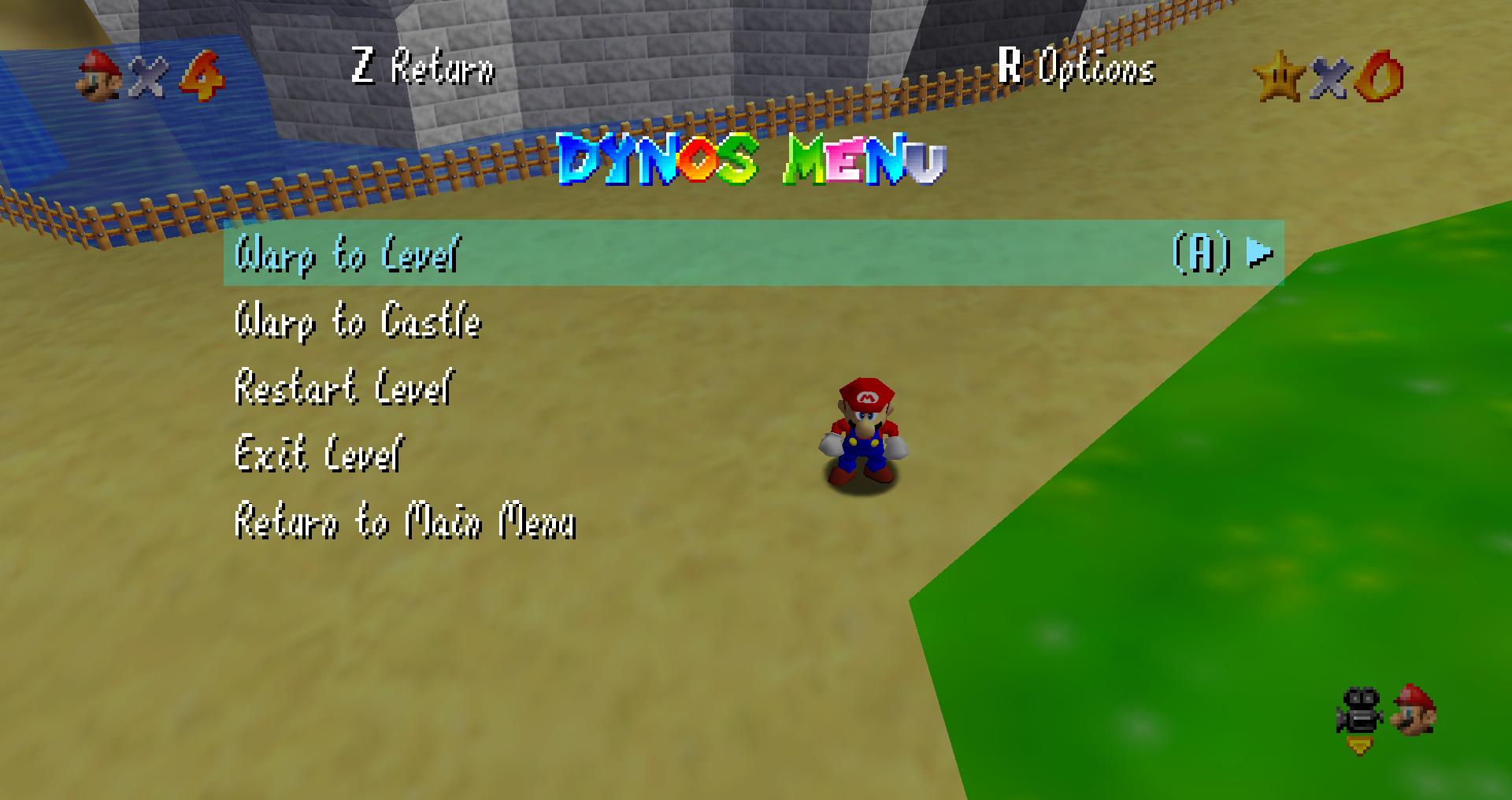 Un menu DYNOS pour pouvoir se téléporter dans un niveau, recommencer un niveau ou retourner au menu.