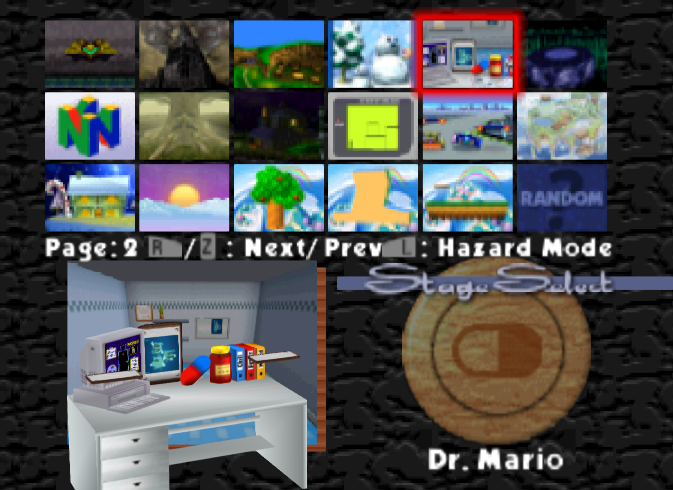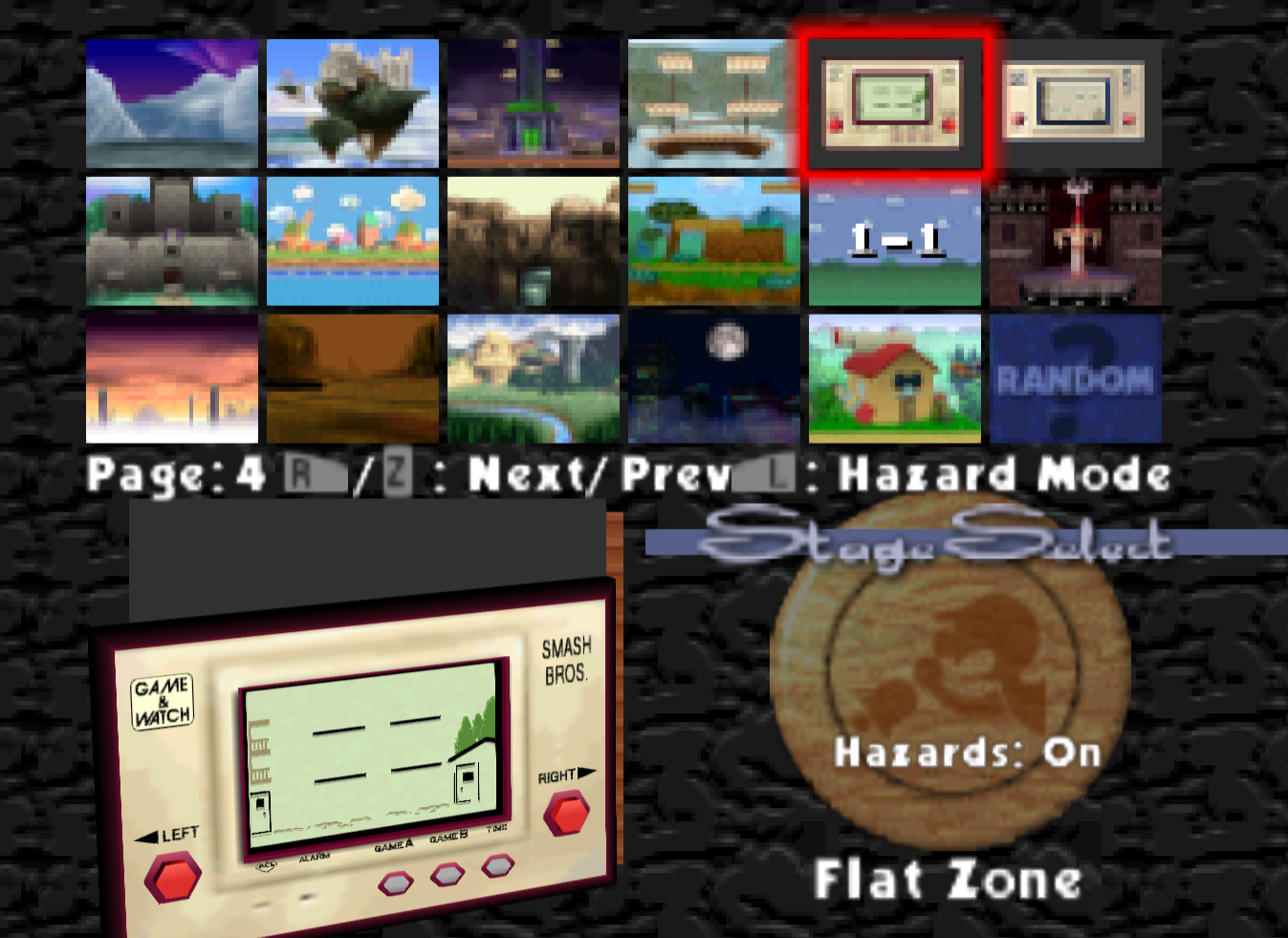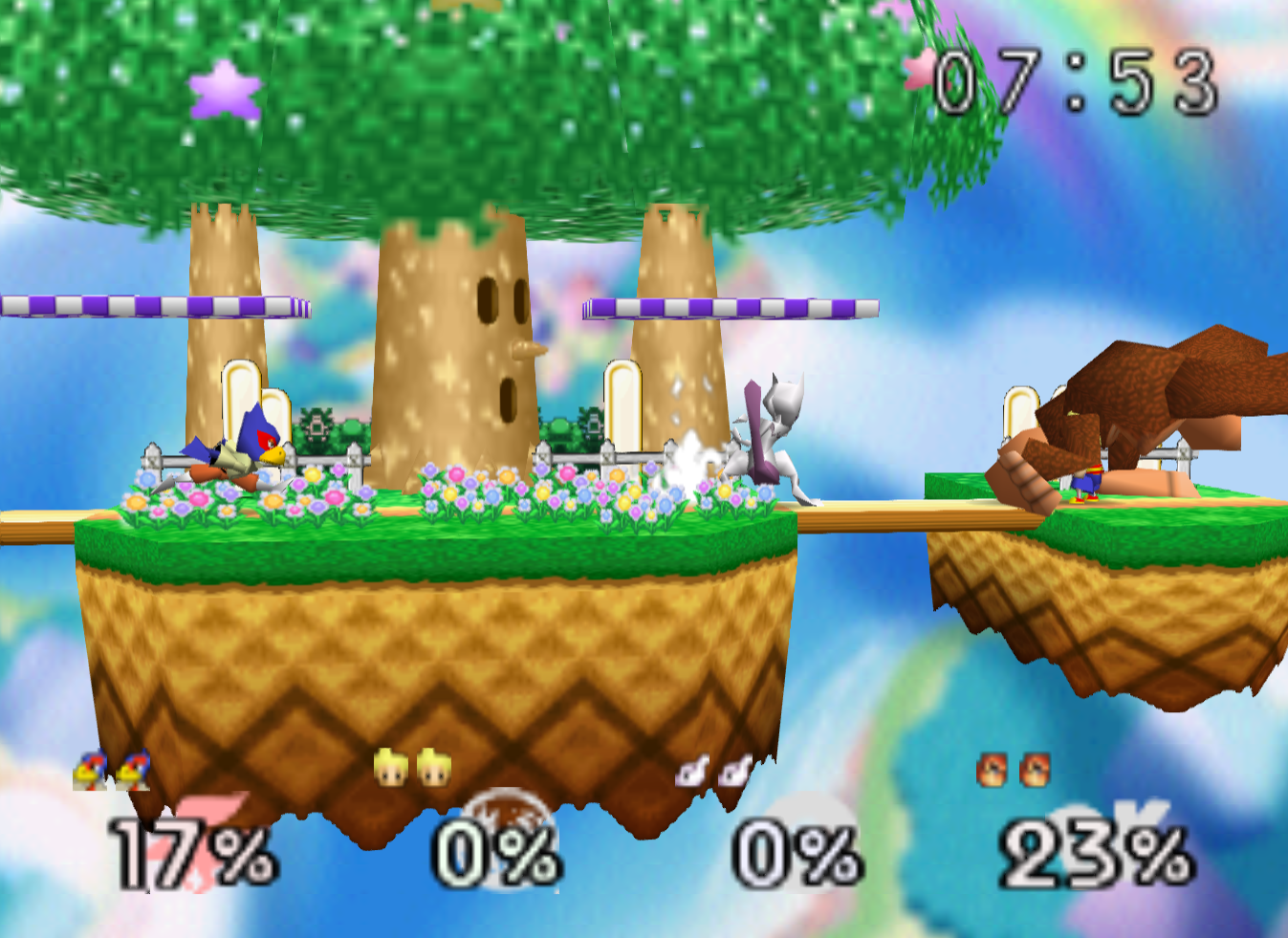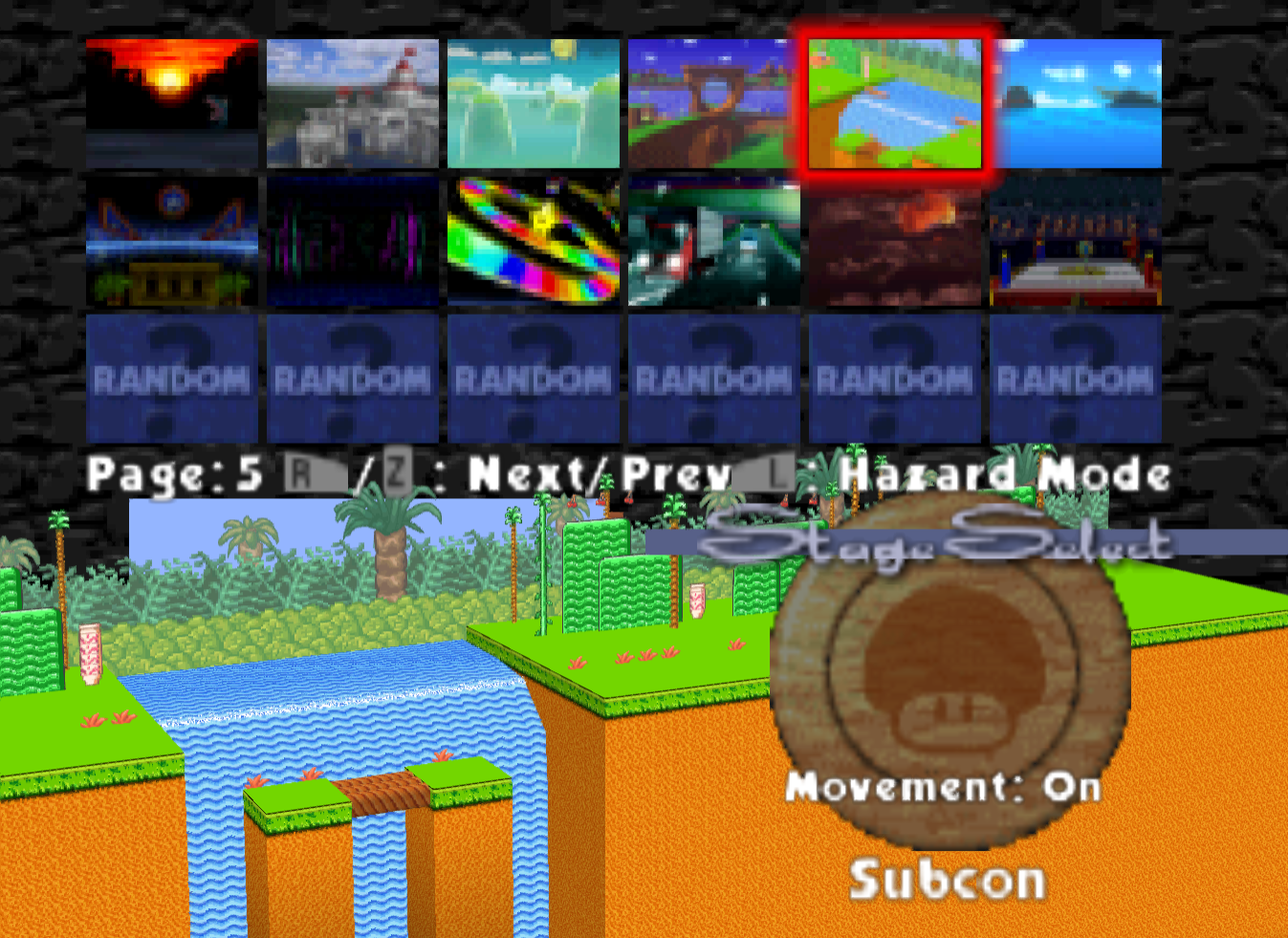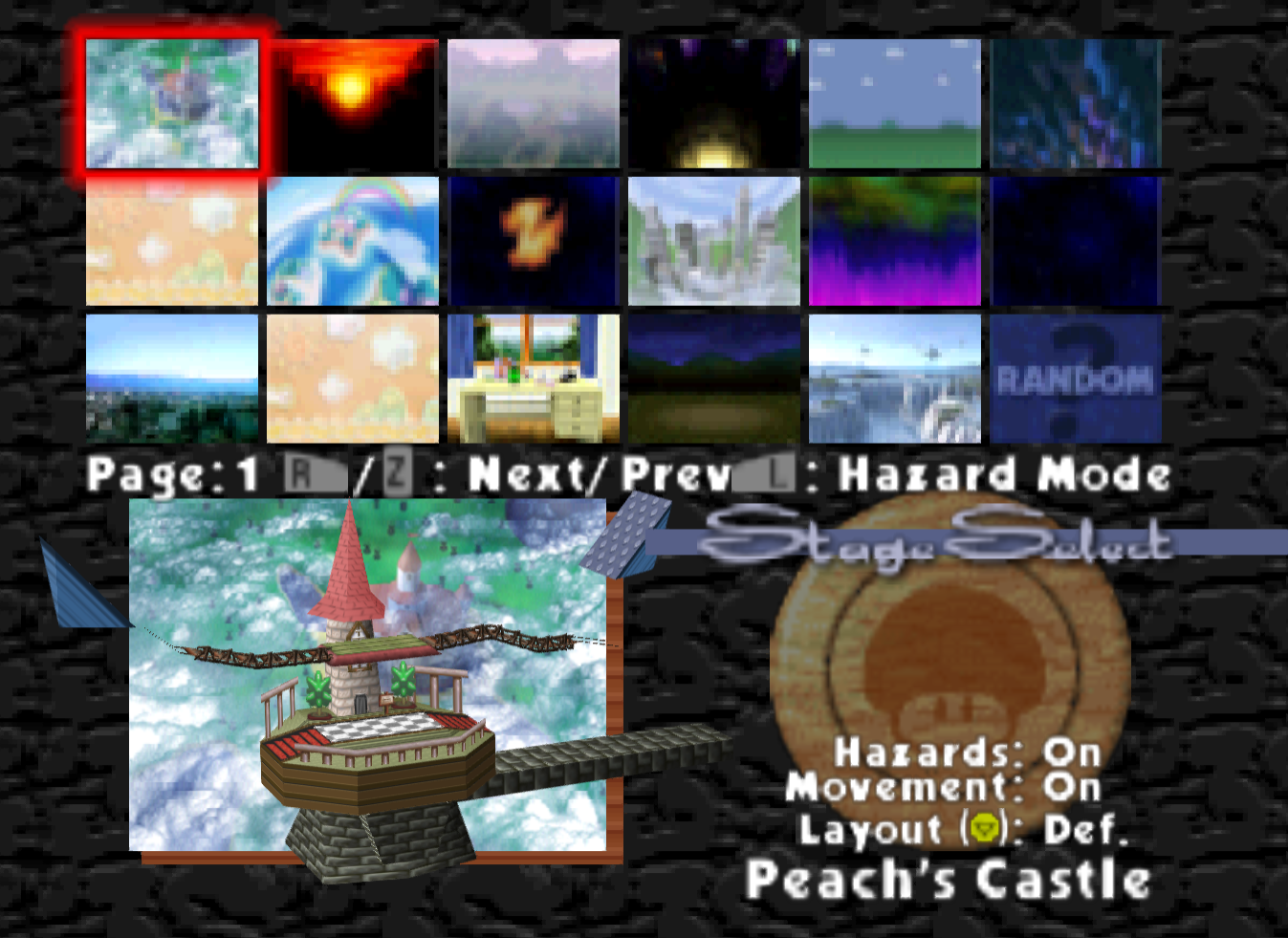- Peach's Castle 2, Mushroom Kingdom, Subcon, Yoshi's Story, Kongo Falls, Jungle Japes, Great Bay, Hyrule Temple, Fountain of Dreams, Dream Greens, Corneria, Venom, Pokémon Stadium, Big Blue, Onett, Flat Zone