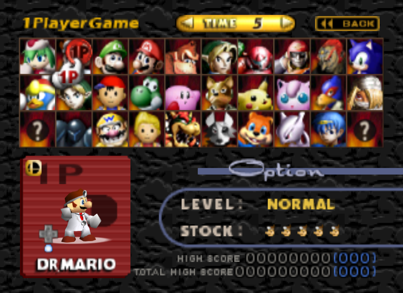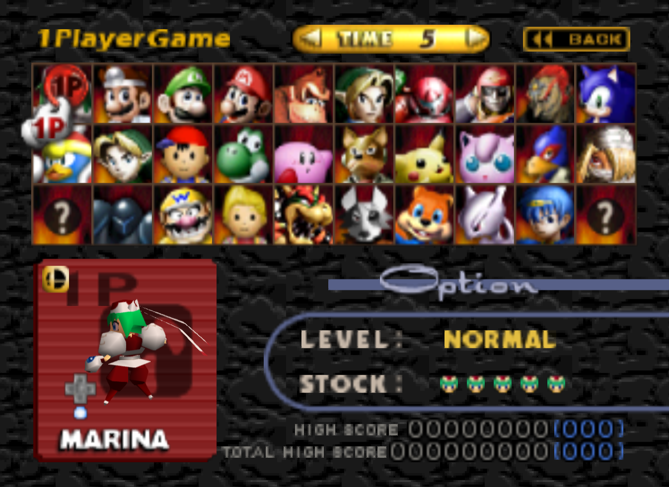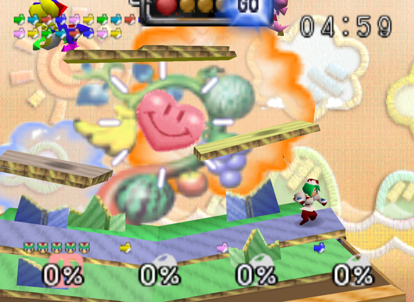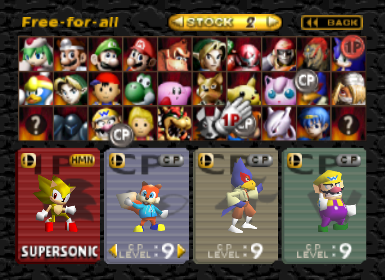 - Peach's Castle 2, Mushroom Kingdom, Subcon, Yoshi's Story, Kongo Falls, Jungle Japes, Great Bay, Hyrule Temple, Fountain of Dreams, Dream Greens, Corneria, Venom, Pokémon Stadium, Big Blue, Onett, Flat Zone